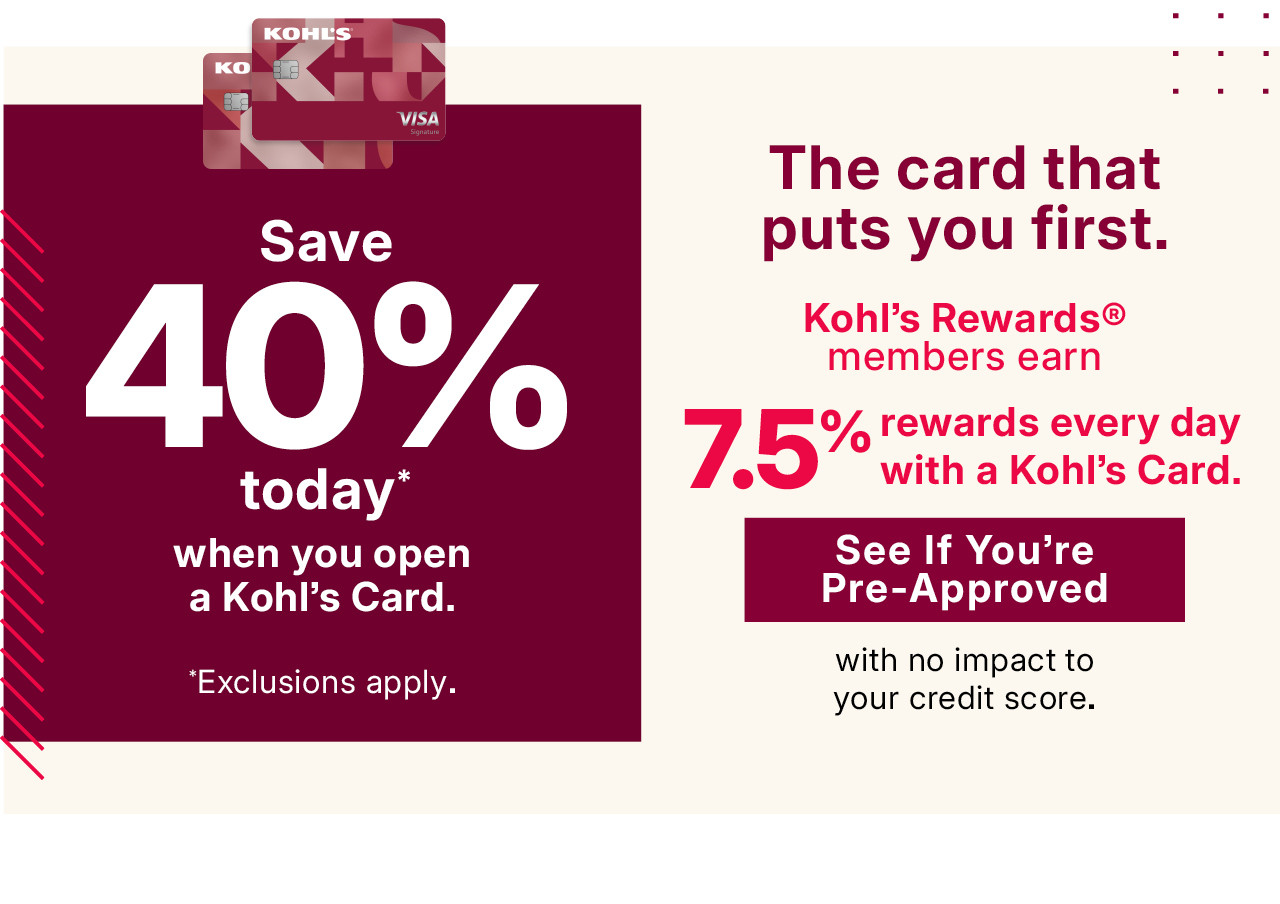 Kohl's Rewards® are earned on the transaction subtotal for qualifying Rewards® purchases at a rate of 7.5% when using a Kohl's Card or 5% with any other tender type. Qualifying Rewards purchases are calculated after all coupons are applied, before shipping, fees or tax is imposed and do not include the purchase of gift cards. For program details and full terms, please visit Kohls.com/KohlsRewards.
